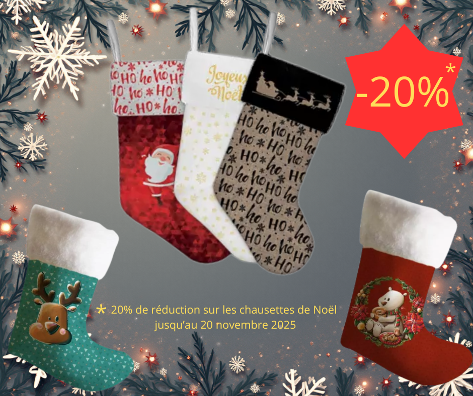 Il est tant de commander vos chaussettes de Noël, et pour cela nous vous offrons 20 % de réduction jusqu'au 20 novembre 2025 !