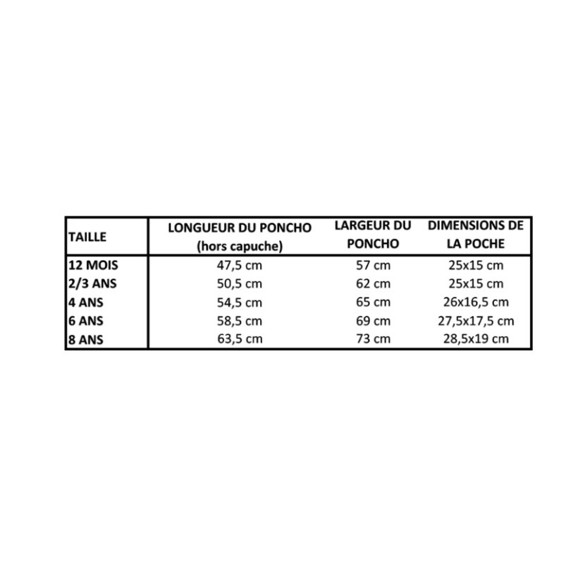 Ce poncho de bain pour enfant est disponible en plusieurs tailles, 12 mois, 2/3 ans, 4 ans, 6 ans et 8 ans.